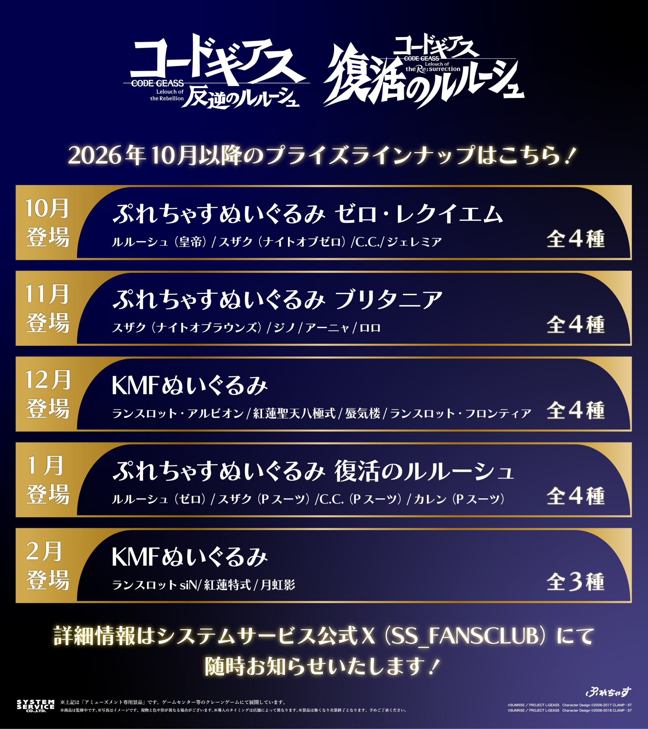 システムサービスより『コードギアス』シリーズのぬいぐるみがプライズで登場!